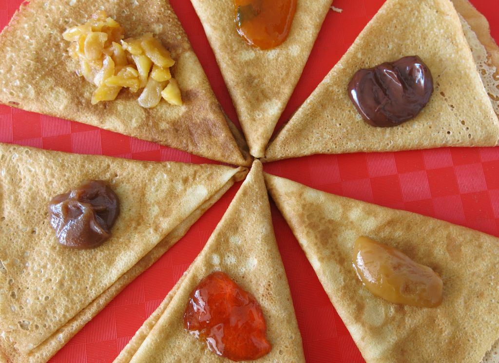 Garnitures : sucre, sucre-citron, beurre-sucre, chocolat « maison », caramel au beurre salé « maison », crème de marrons, confitures, miel